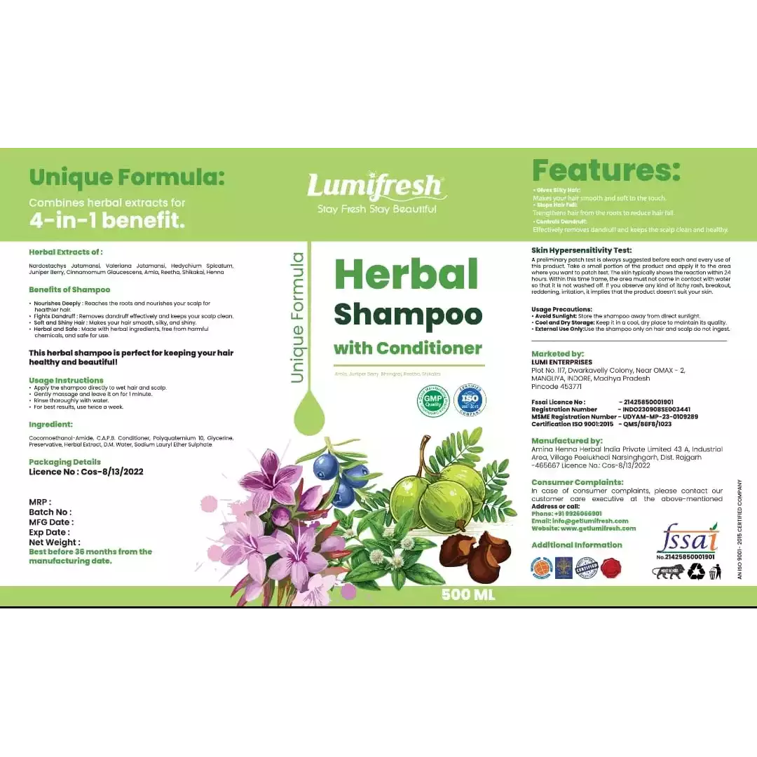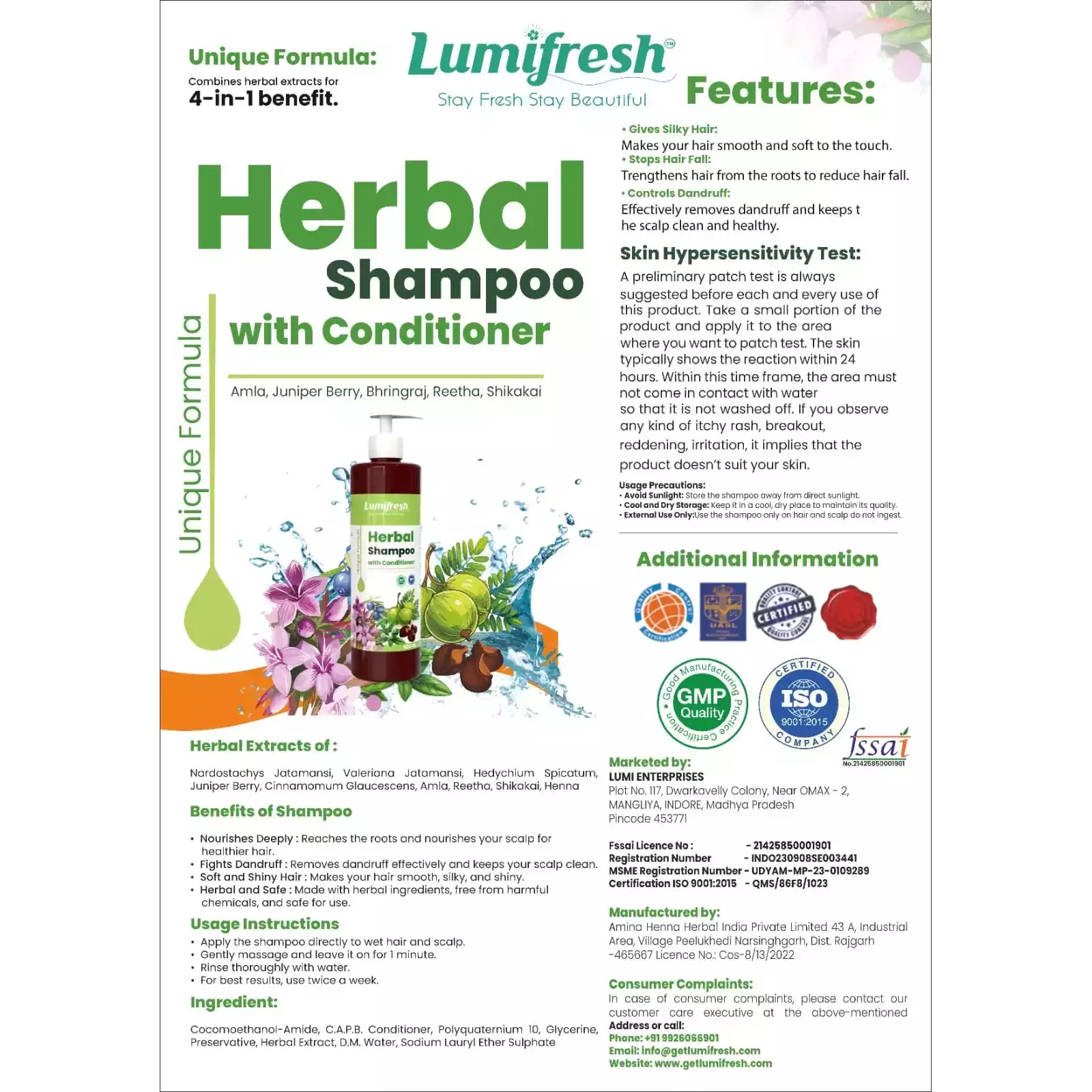 Say goodbye to chemical-based shampoos and hello to natural hair care with Lumifresh Herbal Shampoo with Conditioner. Made with ancient Ayurvedic ingredients like Amla, Bhringraj, Reetha, Shikakai, and Valeriana roots, this shampoo deeply cleanses, nourishes, and conditions your hair – all in one wash. It gently removes dirt and excess oil without stripping natural moisture, leaving your hair smooth, bouncy, and fresh.